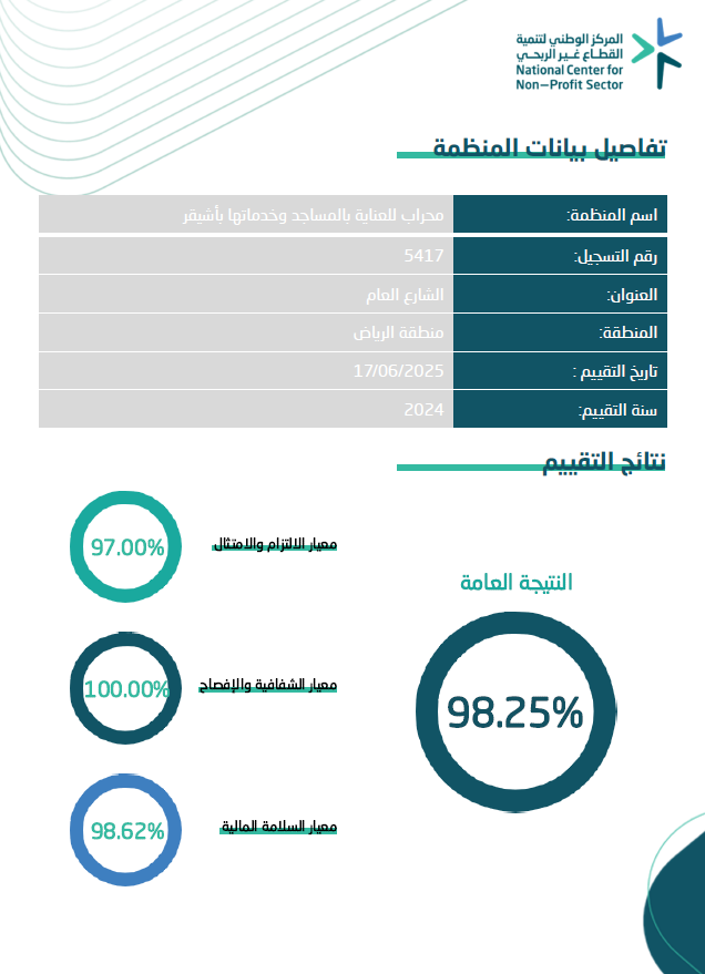 جمعية محراب للعناية بالمساجد وخدماتها بأشيقر تحقق نسبة 98.25% في تقييم الحوكمة الصادر عن المركز الوطني لتنمية القطاع غير الربحي لعام 2024م