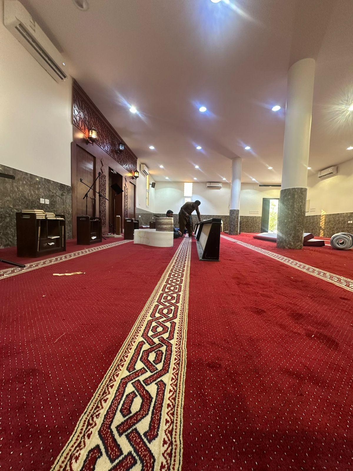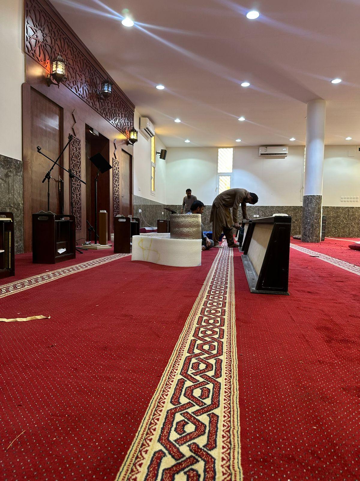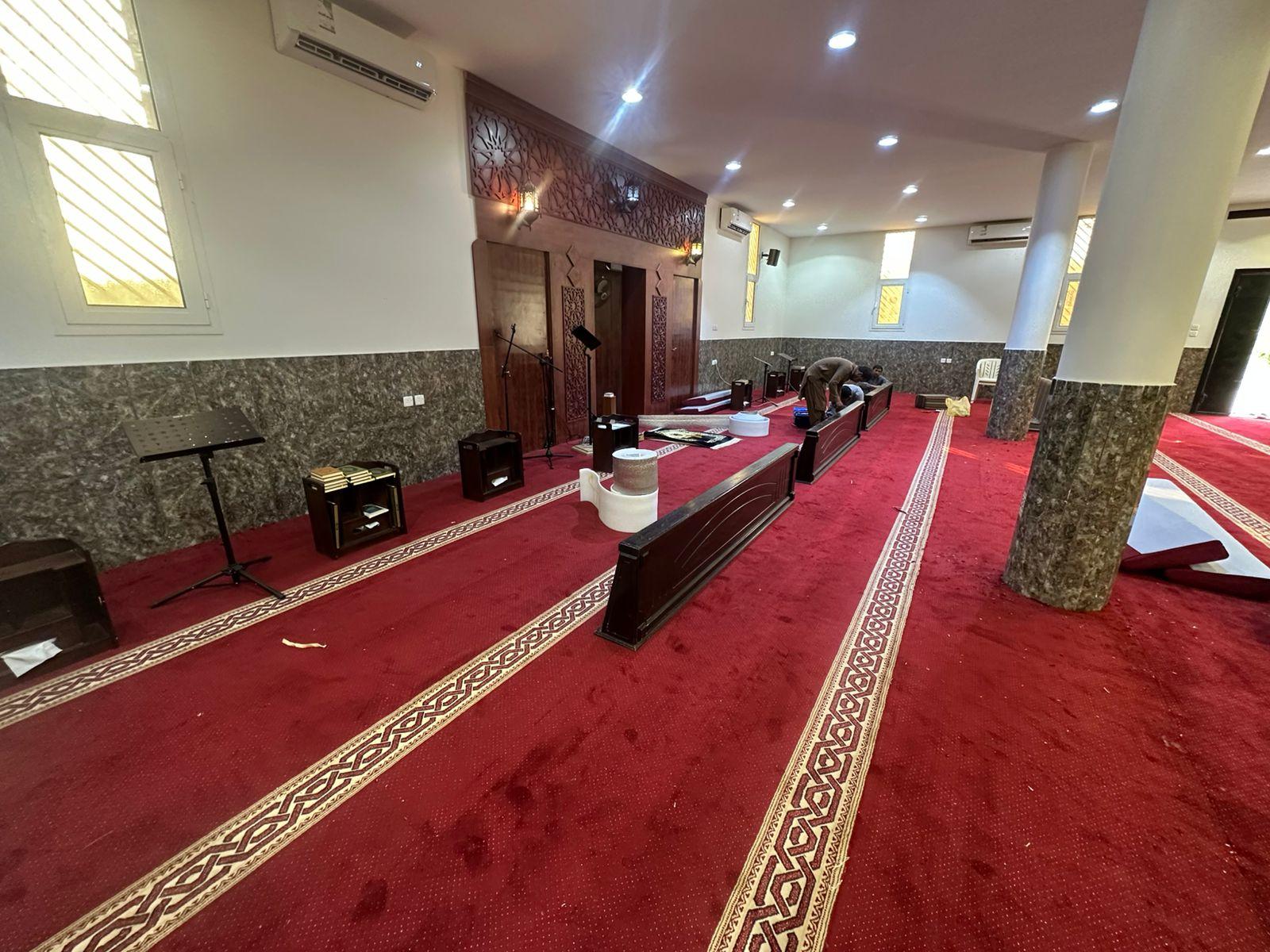وقد شملت أعمال الفرش توفير سجاد عالي الجودة يتناسب مع الطابع المعماري للمسجد.