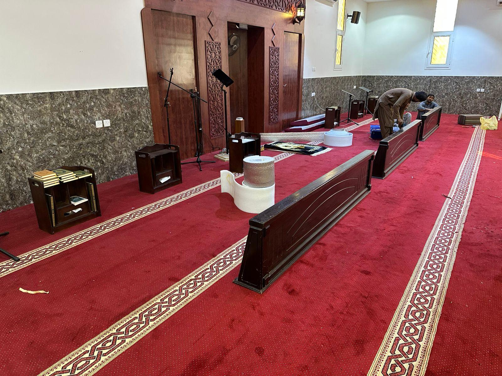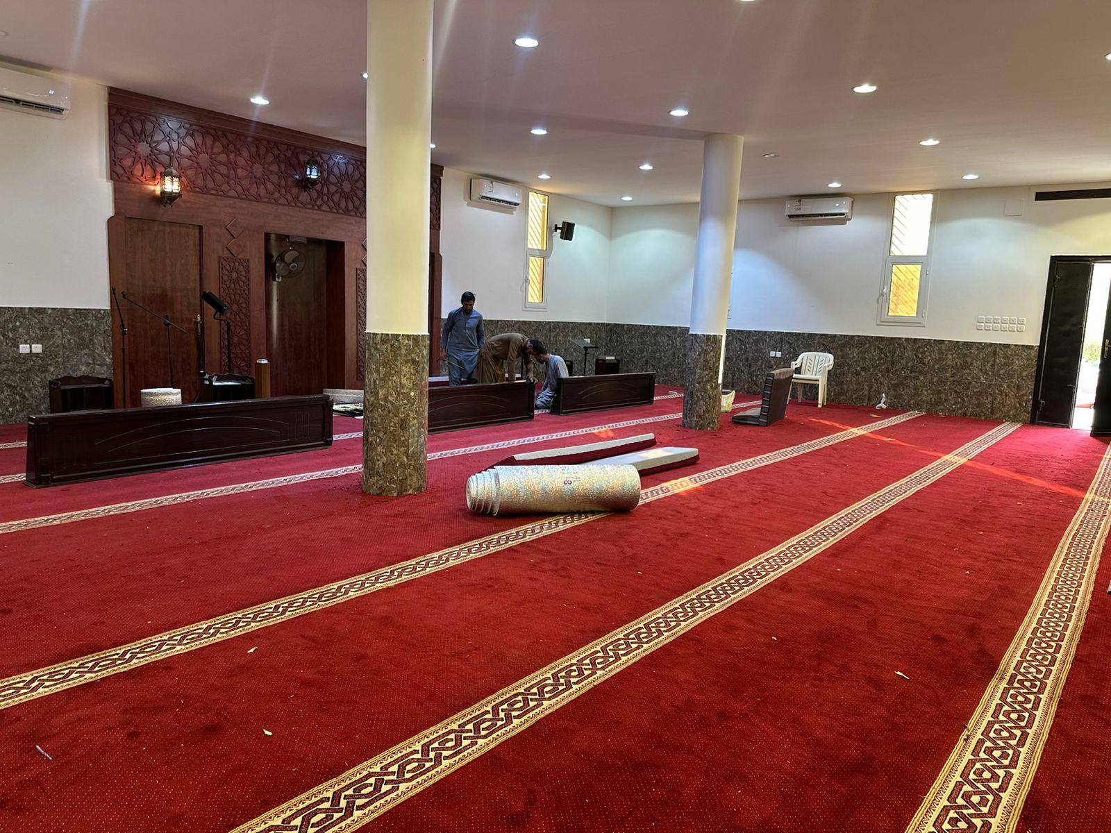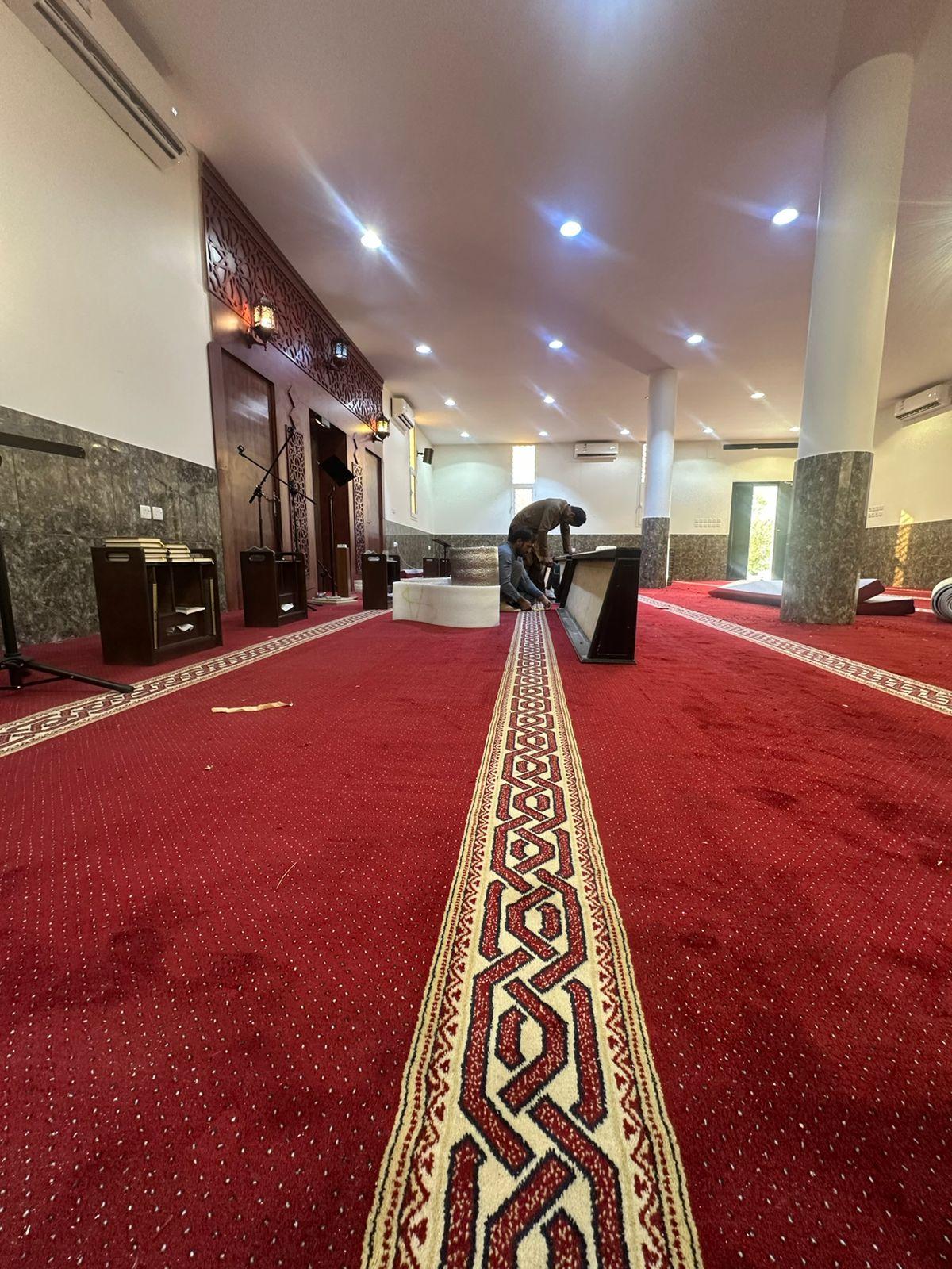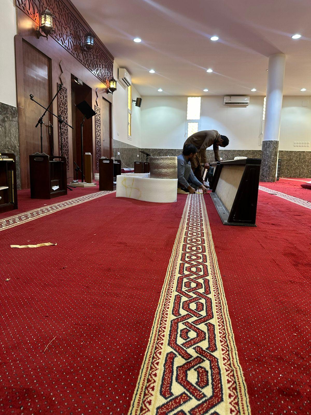 وقد شملت أعمال الفرش توفير سجاد عالي الجودة يتناسب مع الطابع المعماري للمسجد.
